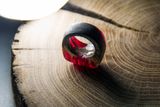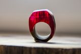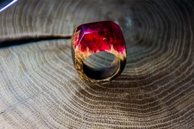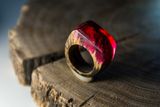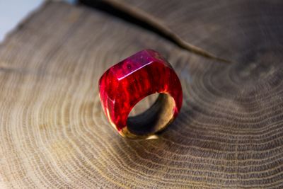 Деревянное кольцо Королевский гранат выполнено из древесины лиственницы с подкрашенной ювелирной смолой, дерево тонировано морилкой цвета *мореный дуб*, размер 16,8