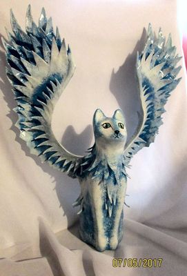 Котик с крыльями, сделан в технике папье-маше. Размер: высота 40 см, ширина 32 см. С грустным взглядом. Он смотрит в небо и ждет когда же на горизонте появятся такие же коты с крыльями. Но он один в своем роде! Своим чистым-белым сердцем он сохранит мир и добро в вашей семье. Рекомендации по уходу: протирать тряпочкой