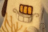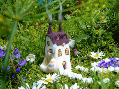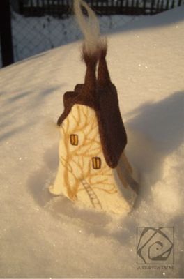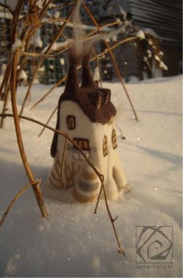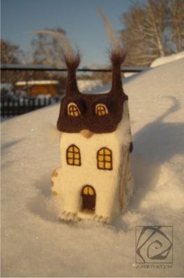 Высота дома включая трубы 13,5 см, ширина 6 см, толщина 8,5 см. Изготовлен из овечьей шерсти. Берегите от маленьких детей, так как игрушка имеет отрывающиеся детали.