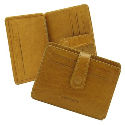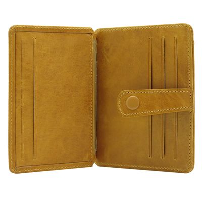 Стильная кожаная визитница, застегивается на кнопку. Ручная работа. Яркий, уникальный дизайн в сочетании с высоким уровнем комфорта в пользовании. Внутри 3 отделения для карточек, 7 удобных кармашков. Окошко-сеточка на задней стороне визитницы. Размер: 10 х 7,5 см Материал: натуральная кожа Цвет: желтый