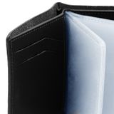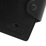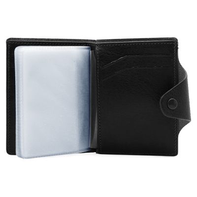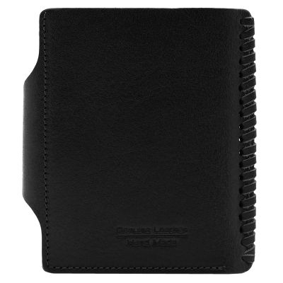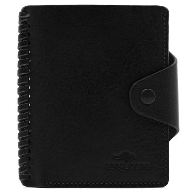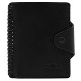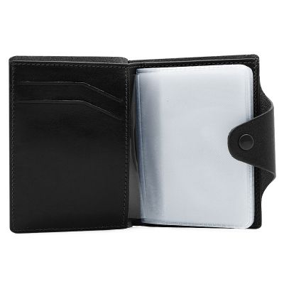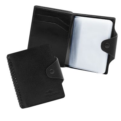 Кожаная визитница с отделением для купюр. Застегивается на кнопку. Стильный аксессуар с оригинальной прошивкой обратит на себя внимание и подчеркнет Вашу уникальность и неповторимость. Изящные линии, функциональность и практичность - отличительные черты визитницы. Внутри 10 файлов для размещения 20-ти карточек, отделение для купюр, 4 кармашка для карточек, дополнительный многофункциональный карман. Размер: 8,5 х 10,5 см Материал: натуральная кожа Цвет: черный