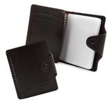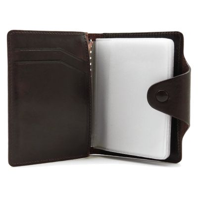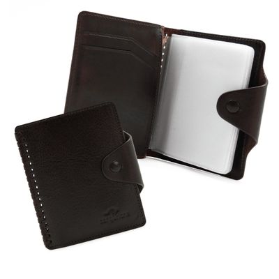 Кожаная визитница на 20 карточек ручной работы. Закрывается на кнопку. Внутри 10 файлов для размещения 20-ти карточек, а также 4 удобных кармашка.