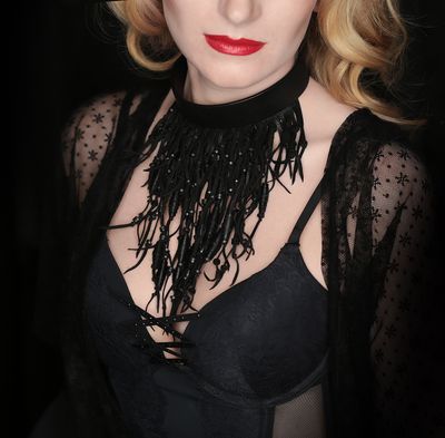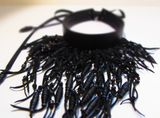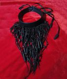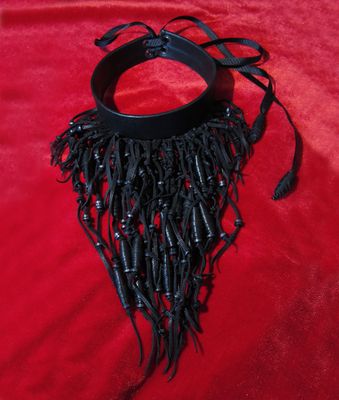Натуральная кожа черного цвета, деревянные бусины. Колье изумительно смотрится на обнаженных шее и плечах, вечерним платьем или кружевным бельем и, конечно же с корсетом. Наркотик для кинестетиков. Благодаря шнуровке размер очень легко регулируется. От 34,5 см. Общая длина: 20 см.