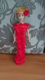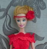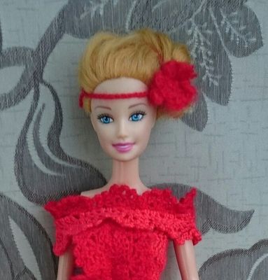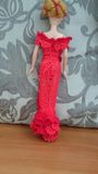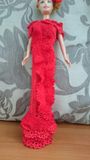 Красное платье вязанное крючком. Длинное, украшенное множеством ажурных оборок. А красная роза в волосах делает образ законченным и ярким.