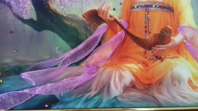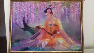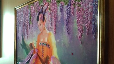 Картина вышита на габардине , атласными лентами, украшена стразами и бусами. На подрамника, оформлена в рамку. Размер 42*32.