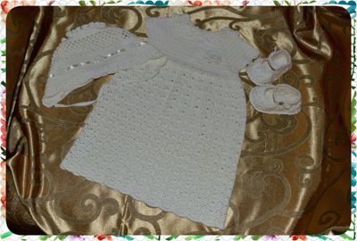 <p><font><font>Крестильный комплек выполнен из мягких хлопковой пряжи цвета айвори </font><font>, с вязаными элементами, и красивый "кристальная" пуговка, чепчик в дополниии украшена атласная лента. </font></font><br><font><font>Полностью ручная работа. </font></font><br><font><font>Возможно повторение в любом другом цвете и комплектации. </font><font>А так же возможно исполнение другие узоры!</font></font></p>