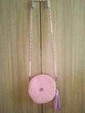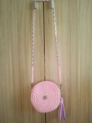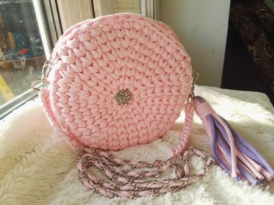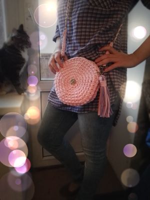 Сумочка-клатч из трикотажной пряжи (хлопок 100%) очень нежного цвета - сакура. Сумочка застегивается на магнитную кнопку, украшена кисточкой (при желании отстегивается и вешается куда душе угодно), ремешок из серебристой цепочки отстегивается - сумочка превращается в клатч)) Диаметр сумочки 21 см. Длина ремешка 120 см.