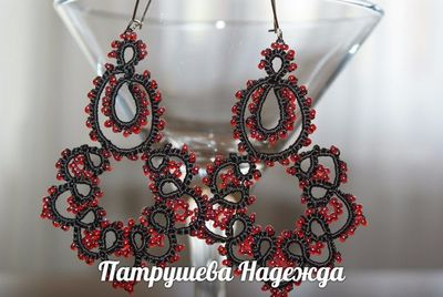 серьги выполнены в старинной узелковой технике фриволите шелк,чешский бисер,швензы.