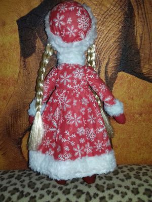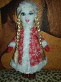 Снегурочка ищет себе дом с новогодней елкой и дедом Морозом ))) сшита из флиса ...наполнитель халлофайбер...искусственные волосы.. атласное платье по низу бусинки...шубка из кулира.. оторочка искусственный мех застежка бусинки...все прошито без применения клея...размер 38 см