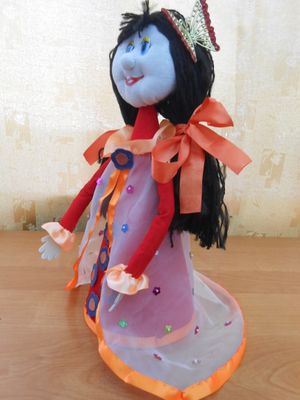 Интерьерная текстильная кукла ручной работы. Кукла сделана на основе картонного конуса, руки на проволочном каркасе могут принимать любую форму. Кукла одета в нарядное атласное платье и накидку, расшитые пайетками. Причёску можно сделать любую. Высота около 30 см. Такая кукла украсит интерьер Вашего дома или станет оригинальным подарком.