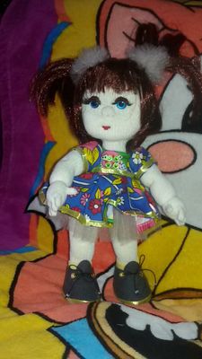 Кукла связана спицами.Нитка-акрил,наполнитель-синтепон. Ручки,ножки подвижны,одежда снимается,волосы можно расчесать,сменить прическу.