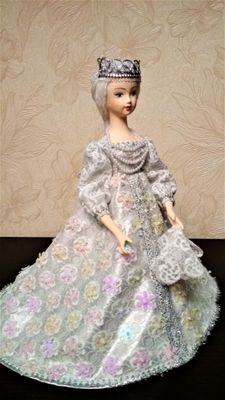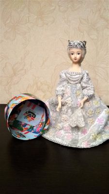 Кукла-шкатулка Снегурочка. Голова и руки-фарфор. Высота 35 см. Внутри круглая картонная коробка, в которую можно положить деньги, конфеты или хранить всякую мелочь.