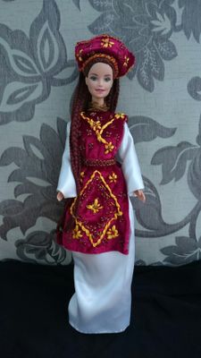 Верхняя часть костюма расшита бисером золотого цвета и желтой атласной лентой, пояс сплетен из бисера в тон. Масивная шапка на голове тоже украшена бисером и лентой. Волосы из пряжи заплетены во множество косичек