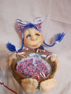 .Капрон,синтепон,шерсть для валяния,ситец,ленты,кружево,пластика,акриловые краски ,лак.рост21 см.,корзинка-d.22 см.Необычный подарочек на праздник хозяюшкам!