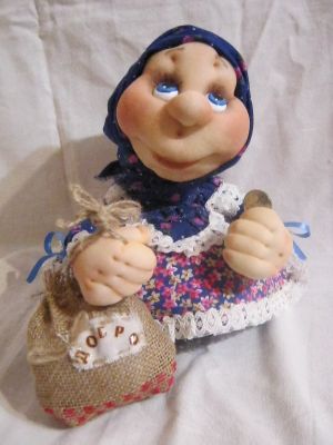 скульптурный текстиль,чулочная техника,проволочный полукаркас,синтепон,ситец,кружево,плоастика,акрил,лак,глазки-ручная работа,ленты,мешковина.