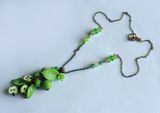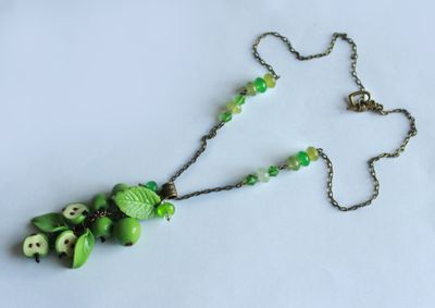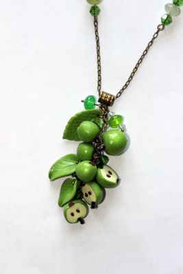 Летний "фруктовый" кулон из полимерной глины. Состоит из зеленых яблочек, целых и половинок, зеленых листьев и стеклянных зеленых бусин. Фурнитура из латуни под бронзу, цепочка украшена стеклянными бусинами.