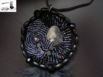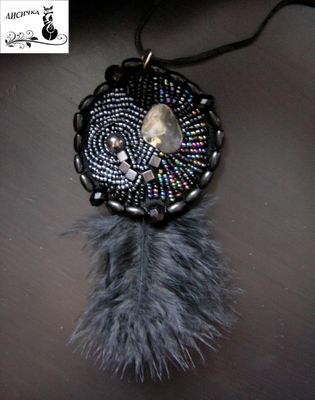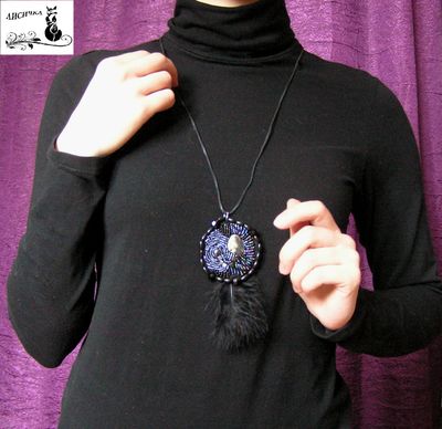 Яркий кулон на кожаном шнуре выполнен из бисера, бусин, и имеет сердцевину из натурального перламутра. Этническую нотку добавляют перья. Перламутр - это сильный оберег от злых духов, оберегает хозяина и приносит удачу. Этот кулон может стать для вас красивым талисманом.