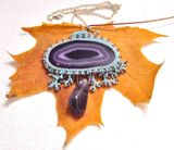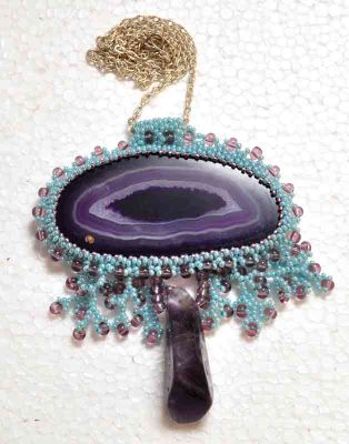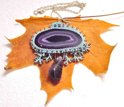 Бразильский натуральный срез агата,пришитое японским и чешским бисером. Подвеска натуральный камень Аметист. Цеп под серебро,не темнеет. Длина изделий 40см,можно регулировать.