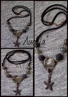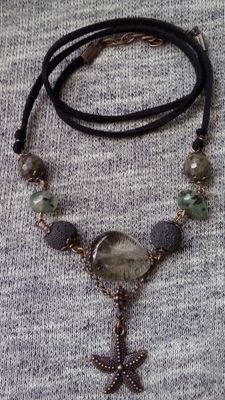 Кулон с натуральными камнями (яшма,вулканическая лава, зеленый гранат) на длинном замшевом шнуре.