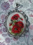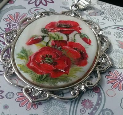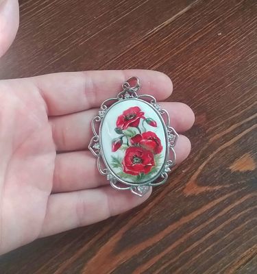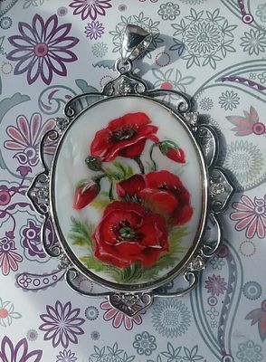 Роспись маслом по перламутру в стиле лаковой миниатюры. Длина кобошона 4 см.
