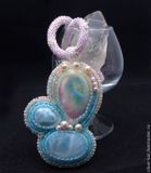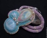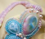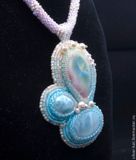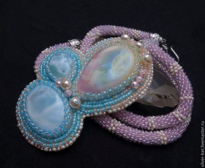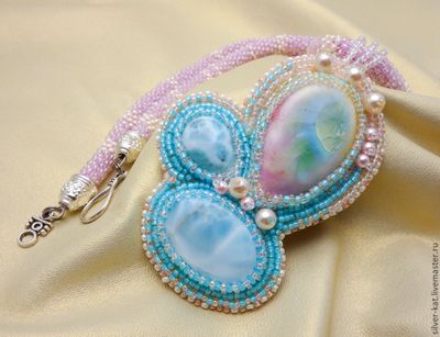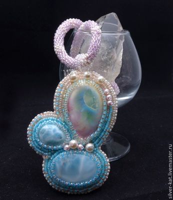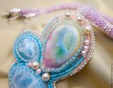 Кулон "Сакура цветет" с двум ларимарами и прекрасным керамическим кабошоном авторства Татьяны Клешниной. Ларимар - гость из далекой Доминиканской республики. Там находится единственное в мире месторождение этого камня.