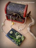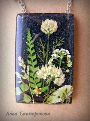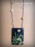Темное небо с мерцающими огоньками звёзд. Душистое разнотравье. Запах костра. Необыкновенное умиротворение и покой. Лишь изредка нарушает ночную тишину всхрапывание лошадей, отдыхающих от летнего зноя. Вот такие ассоциации у меня вызывает кулон, который я так и назвала - "В ночное". Получилась целая картина из трав и цветов на тёмно-синем слегка мерцающем фоне размером 6,2х4 см. Кулон вышел солидный, толщиной 7 мм, на цепочке серебристого цвета с бусинами оникса различного оттенка. Длина цепочки 57 см + 5 см удлинительная.