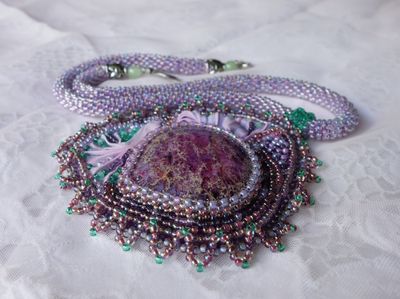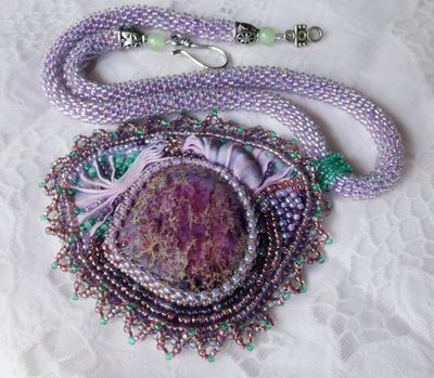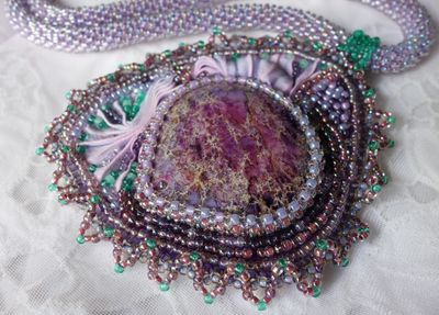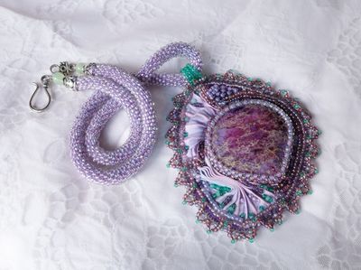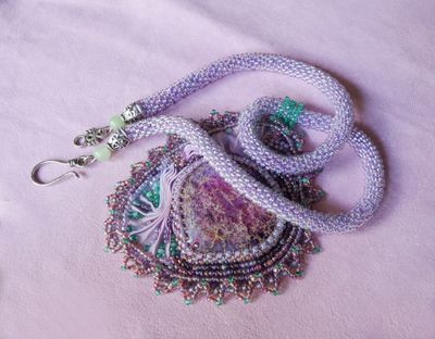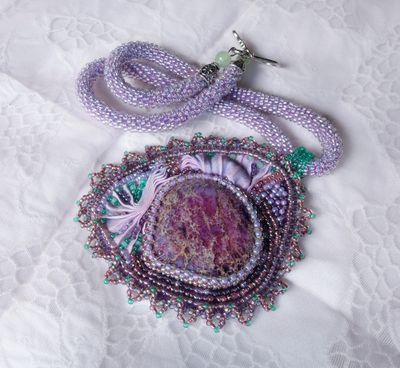 Камень - имитацтия варисцита. Обшит японским бисером и декорирован лентой шибори. Размер кулона: 7х8 см Длина подвеса: 43 см
