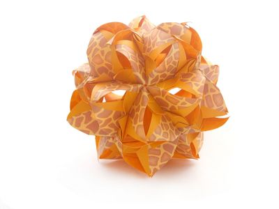 Кусудама - бумажная модель шарообразной формы, выполненная в технике оригами и состоящая из множества одинаковых модулей. В настоящее время кусудамы используется как оригинальное украшение интерьера, а в древности они служили ёмкостью для целебных трав и благовоний и назывались лечебными шарами. Согласно учению фэн-шуй, кусудамы аккумулируют положительную энергию. Кусудама сделана из специальной корейской бумаги, украшена обвесом из бусин и сердечка-оригами. Диаметр кусудамы ~10,5 см, длина с обвесом 60 см. Автор - Наталия Романенко. Исполнитель - Юния Филонова.