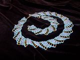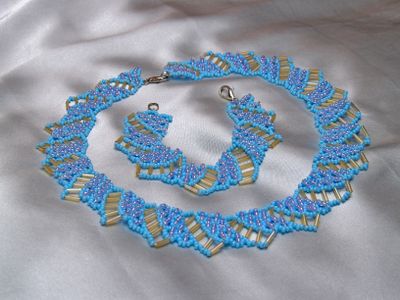 Лазурное ожерелье и браслет из чешского бисера. Ручная работа. Ожерелье и браслет имеют объемный вид, благодаря нанесению бисера вторым слоем. Нежно розовые вставки красиво переливаются на солнце. Возможно изготовление аналогичного комплекта на заказ в другой цветовой гамме.