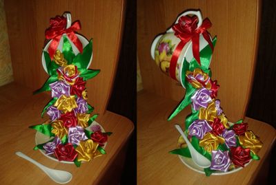 Чудесная композиция с розами из атласный лент. Чашечка, блюдце и ложечка керамические. Крепление прочное. Отличный подарок и украшение для дома )