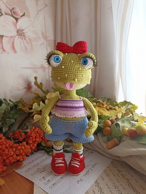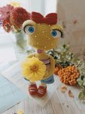 Вязаная игрушка крючком из полухлопковой пряжи, на проволочном каркасе, ручки и ножки сгибаются, размер 27-28 см.