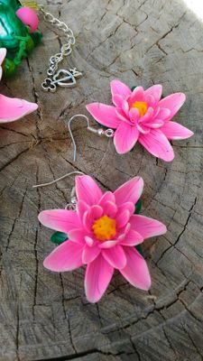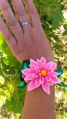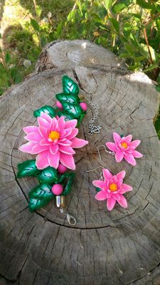 Браслет и серьги выполнены из запекаемой полимерной глины, браслет собран на вощенный шнур с добавлением бусин длина 16,5 см + удлинительная цепочка. Серьги- цветок диаметр 3см
