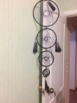 Могу предложить вам оригинальный подарок на все случаи жизни, который запомнится и будет приятен всем, даже если подарите его сами себе :) По индейской легенде плохие сны запутываются в сетке и с первыми лучами солнца сгорают, а хорошие - проходят через центральное отверстие. Обычно ловцы вешают у изголовья кровати или на люстру. Диаметр первого равен 25 см, второго - 20, предпоследнего - 15, последнего - 5 см.