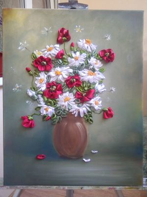 Исключительно авторская работа. Исполнена атласными лентами на польском холсте с подрамником. Фон - масляными красками. Размер картины 40*50