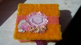 шкатулка с 3 ящичками.рамка для фотографии. блокнот для записей(на фото его нет).крышка сделана из меха и шелковых цветов.
