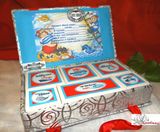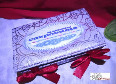 Ручная работа, создана руками Ксении. Цвет серебряный, ткань портьерная, морская тематика, размеры 24,5*14,5 см. Внутри картонные коробочки для бирочки, зубика, соски, теста, локона и конверт для фото УЗИ. Возможно изготовление на заказ по вашему желанию. Цена будет зависеть от размеров,количества коробочек внутри, ткани и сложности изготовления.