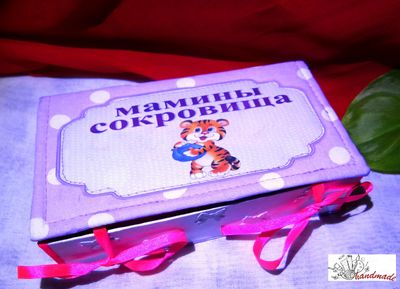 Ручная работа, создана руками Ксении. Цвет лиловый, ткань х/б, размер 10*19 см. Внутри картонные коробочки для бирочки из роддома, зубика, локона, теста, приятных ценностей. Цвет у коробочек розовый, но надпись на крышке "Я родился" (имеется ввиду малыш родился). Возможно изготовление на заказ по вашему желанию. Цена будет зависеть от размеров,количества коробочек внутри, ткани и сложности изготовления.