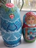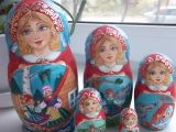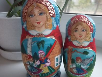Матрешка " Красная шапочка "расписана гуашью и акварелью , в росписи использована поталь /имитация сусального золота/ , на животе нарисованы картинки с сюжетами из сказки , будет прекрасным подарком для ребенка или коллекционера , любого другого человека , который любит сказки.