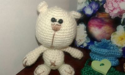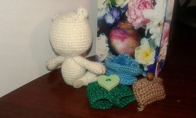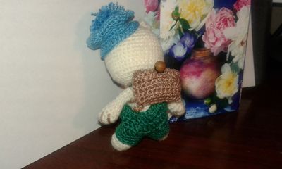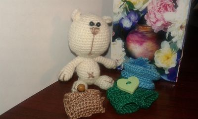 Мишутка ростом (стоя)9 см. Связан из 100% шерсти,глаза бусины,наполнитель синтепух,ножки на пугвичном креплении(может сидеть).Имеется гардероб: шорты,шапка и портфель.(все съемное).может служить как дополнение к подарку,как подарок,как брелок