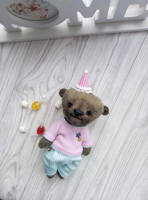 Мишка тедди, выполнен из вискозы, лапки и голова подвижные, набит опилками. Одежда съёмная. Ищет свой дом.