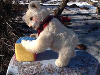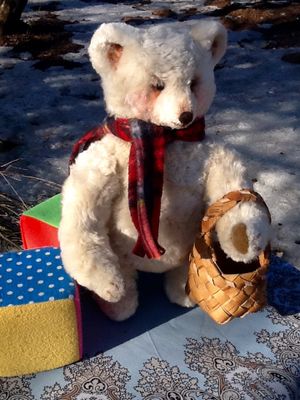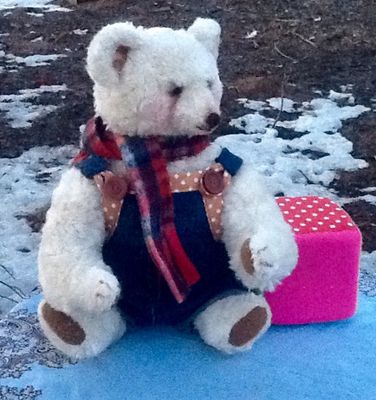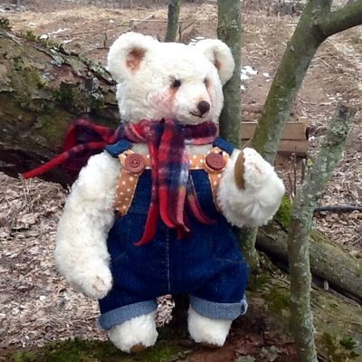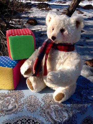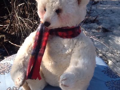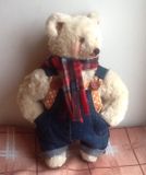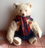 Традиционный Мишка в технике Тедди. 5 шплинтов, вышитый нос, тонировка. Стоит с опорой, сидит уверенно. Выполнен из вискозы молочного цвета с разнонаправленным ворсом. Можно давать детям с 4-х лет. Комбинезон и шарфик легко снимаются и одеваются. 27см стоя.