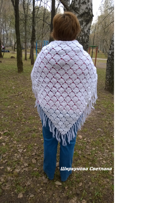 Белоснежная шаль, связанная крючком из турецкой пряжи ALIZE (мохер с акрилом). Мягкая и нежная на ощупь, не колется. Теплая - можно использовать как зимний аксессуар или как накидку в прохладные летние вечера. Ручная работа. длина 162 см, высота 93 см, кисти 13 см