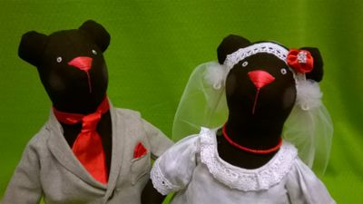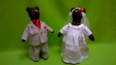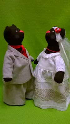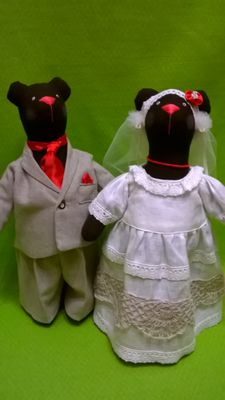 Молодожены : медведь Михаил и медведица Настёна. Михаил в льняном модном костюме с галстуком, Настёна в свадебном платье, украшенном кружевом ручной работы на коклюшках. Вся одежда снимается. Молодожены могут стоять или сидеть. Рост молодоженов около 35 см.