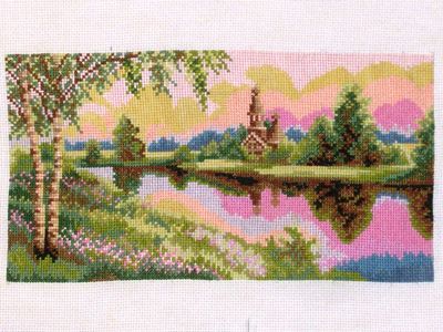 Вышитая картина крестиком На розовой зорьке Полная зашивка. Размер вышивки: ширина 31 см, высота 17 см. Общий размер: ширина 36 см, высота 28,5 см. Работа не оформлена (баз багета).