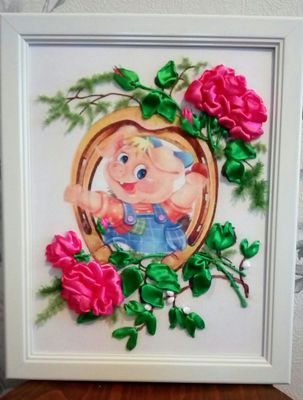 картина вышита атласными лентами ,оформлена в багет без стекла
