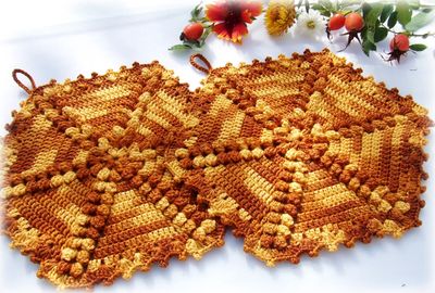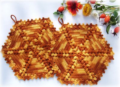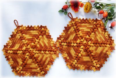 Набор кухонных прихваток выполнен из плотного 100% мерсеризованного хлопка в виде шестиугольника. Отличный подарок для хороших хозяек, тех, у кого кухня - любимое место и любимое занятие - приготовление вкусных блюд. Набор из двух прихваток - 450р. Одна прихватка - 230р. Наибольший диаметр 20 см