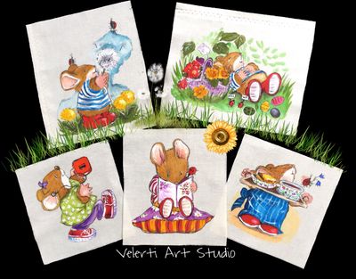 Набор: «Летние Каникулы Мышонка» 5 шт. + 1 купон в подарок смотреть 2 -е фото : Мышонок с мороженым. Выполнены из 100% хлопка, про-во Швеция. Подходит для декорирования, изготовления сумок,кошельков,блокнотов, чехлов , а также для различных вставок к примеру на детское одеяло подойдет как украшение наволочки. Также можно оформить в рамочку и декорировать стену. Все рисунки на ткани нанесены вручную текстильными красками нашими художниками. Краски абсолютно безопасные на водной основе , но очень практичны, поэтому изделие с рисунком можно смело стирать и гладить через хлопковую ткань. Акриловые краски яркие и не выцветают на солнце. Размеры: 13х12 см и 13х17 (уже с прибавками) варьируются.