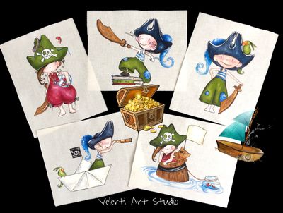Набор: «Пираты» 5 шт. Выполнены из 100% хлопка, про-во Швеция. Подходит для декорирования, изготовления сумок,кошельков,блокнотов, чехлов , а также для различных вставок к примеру на детское одеяло подойдет как украшение наволочки. Также можно оформить в рамочку и декорировать стену. Все рисунки на ткани нанесены вручную текстильными красками нашими художниками. Краски абсолютно безопасные на водной основе , но очень практичны, поэтому изделие с рисунком можно смело стирать и гладить через хлопковую ткань. Акриловые краски яркие и не выцветают на солнце. На фото пример как можно декорировать детскую одежду нашими текстильными купонами с росписью. Размеры: 16x20 см. (уже с прибавками) варьируются.