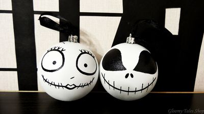 Джеку на ёлке теперь составляет пару Салли, персонаж того же мультфильма ("Кошмар перед Рождеством"). Сделаю на заказ в большем количестве. Также возможен на выбор любой из вариантов Джека. В набор входит два шарика, расписанных вручную, и две черные ленточки. Цвет ленточки также возможно заменить. Размер шариков на фото - 8 см. Можно заказать 5 см. Протирать сухой салфеткой