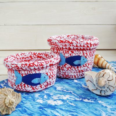 Любителям моря и морского стиля посвящается. Набор из 2х вязаных туесков с аппликациями из фетра. Отлично подойдет для хранения всяких мелочей, таких как ключи, конфеты, резиночки-заколочки, помады и любые другие мелкие предметы. Независимо от погоды за окном, морской декор напомнит об отпуске и море ). Размеры: Диаметр по донышку у обоих туесков 11 см, высота малого - 6,5см, высота большого - 10см. Набор из 2х туесков стоит 800руб.